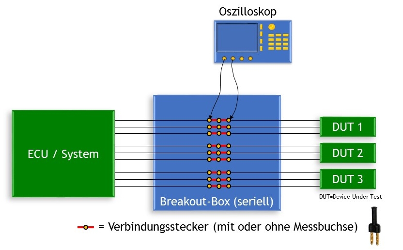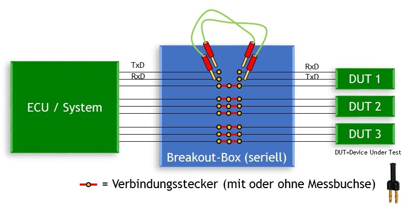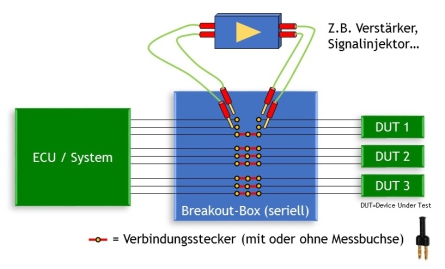Wird ein Stecker gezogen, so wird die entsprechende Leitung unterbrochen und im System ergibt sich ein Fehler. Dabei ermöglicht die Box nun an der Stelle des gezogenen Steckers, Messungen auf der Ein- wie auch auf der Ausgangsseite der betroffenen Leitungen durchzuführen.