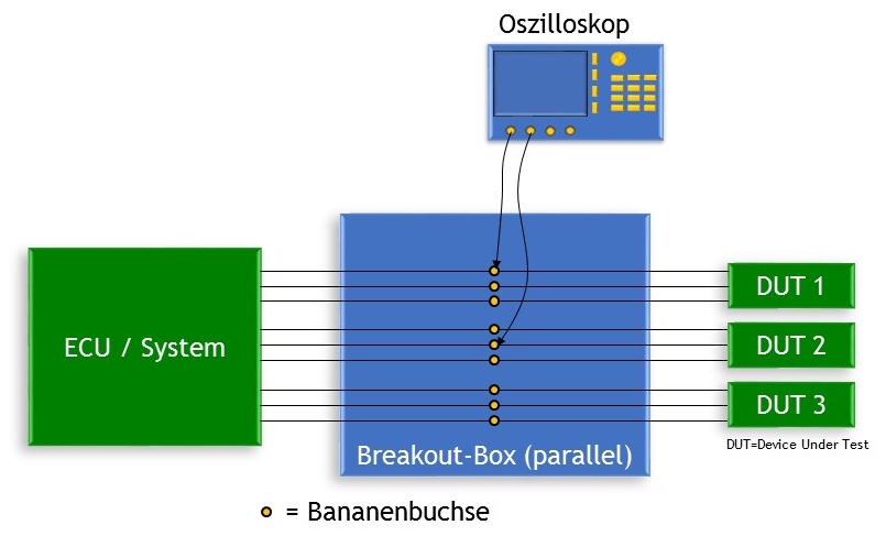 Eine parallele BOB entspricht einfach einem Gerät, das über ein Steckersystem mit einem zu prüfenden Gerät verbunden eine Vielzahl von Messpunkten des zu testenden Geräts zugänglich macht.